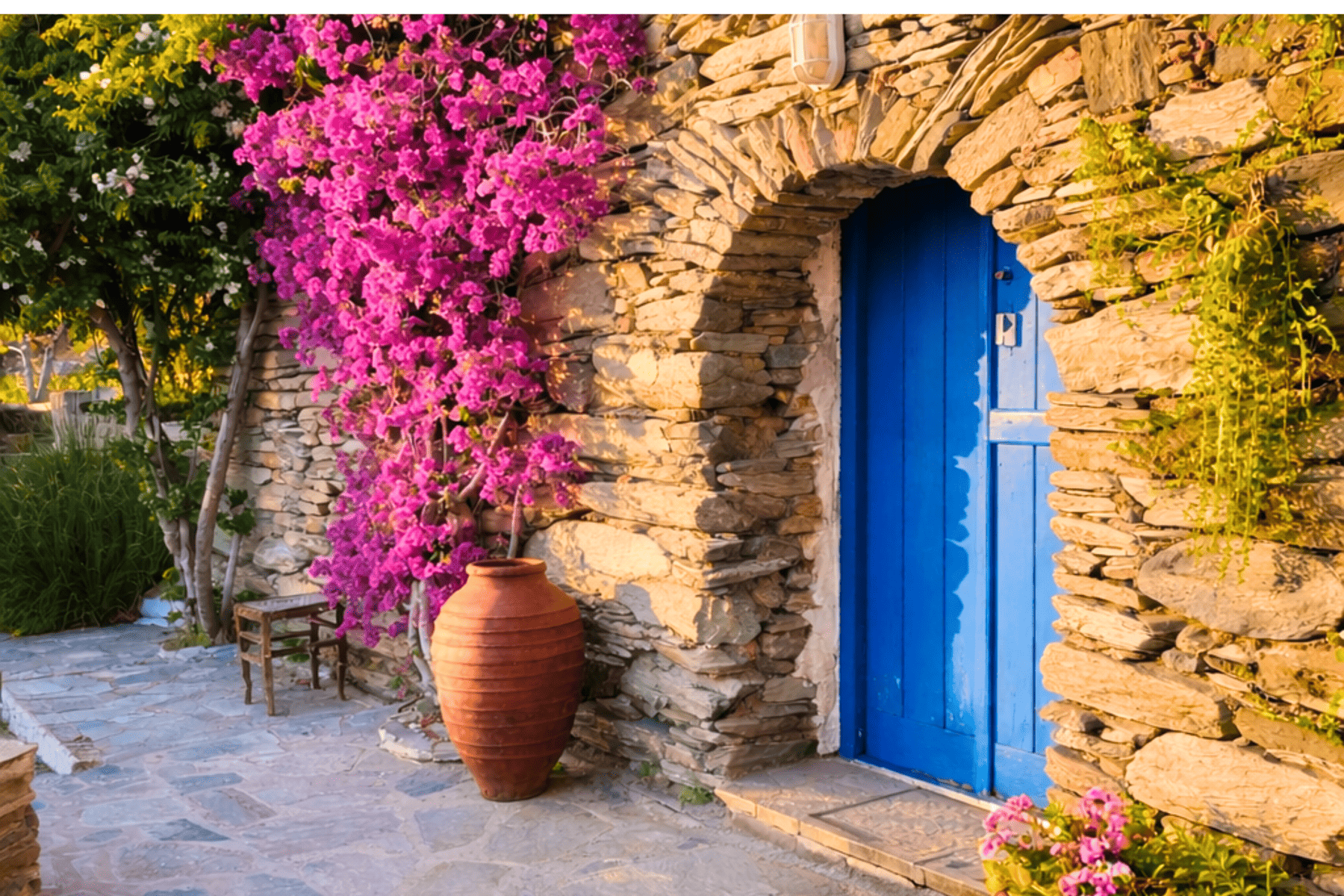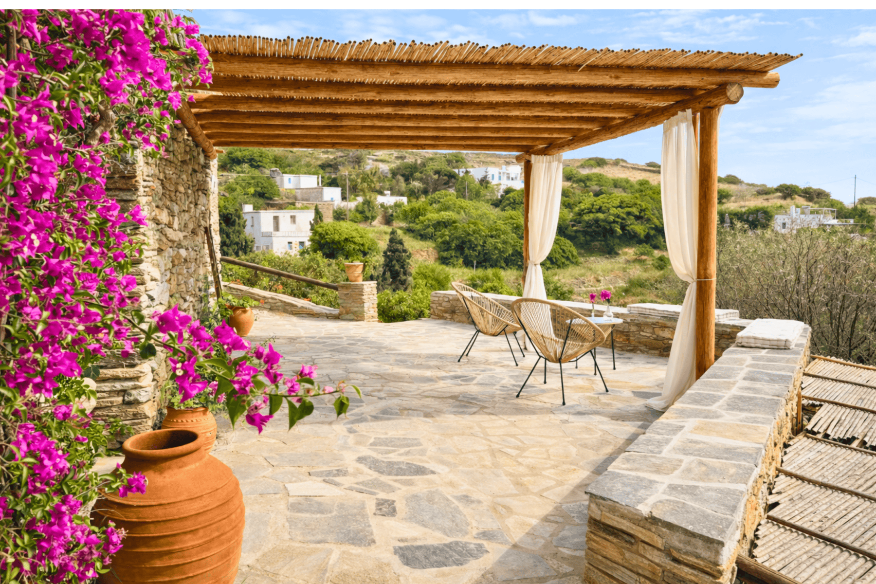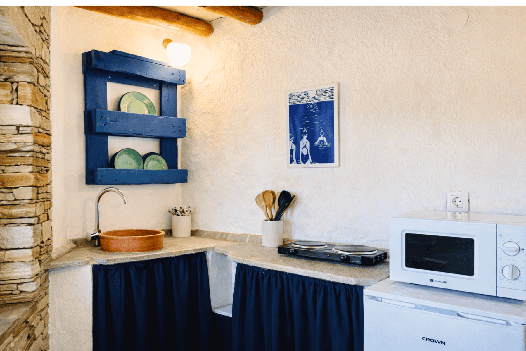 • Authentischer kykladischer Charme: Steinmauern, traditionelle Holzbalken und Dekor im lokalen Stil