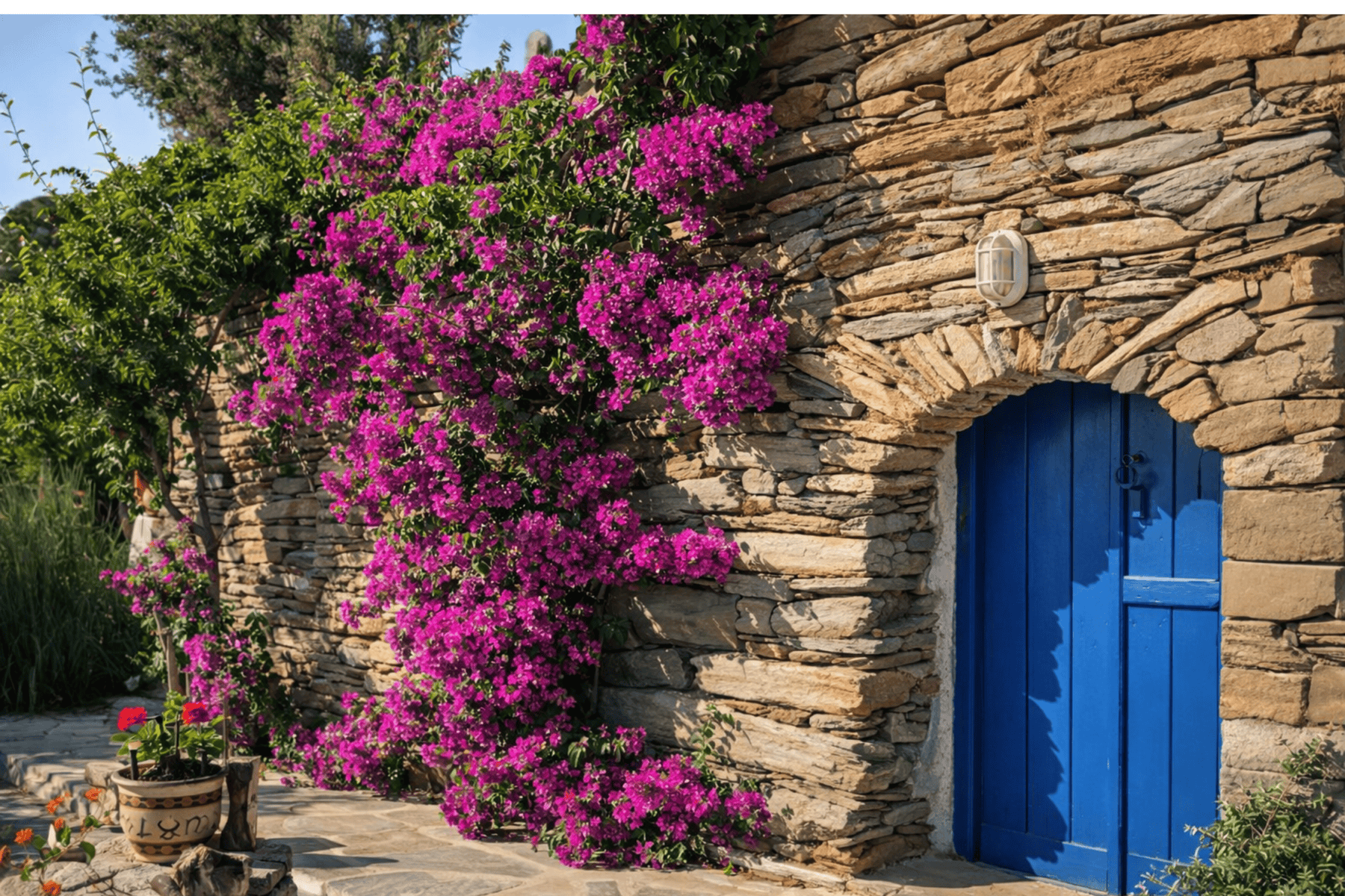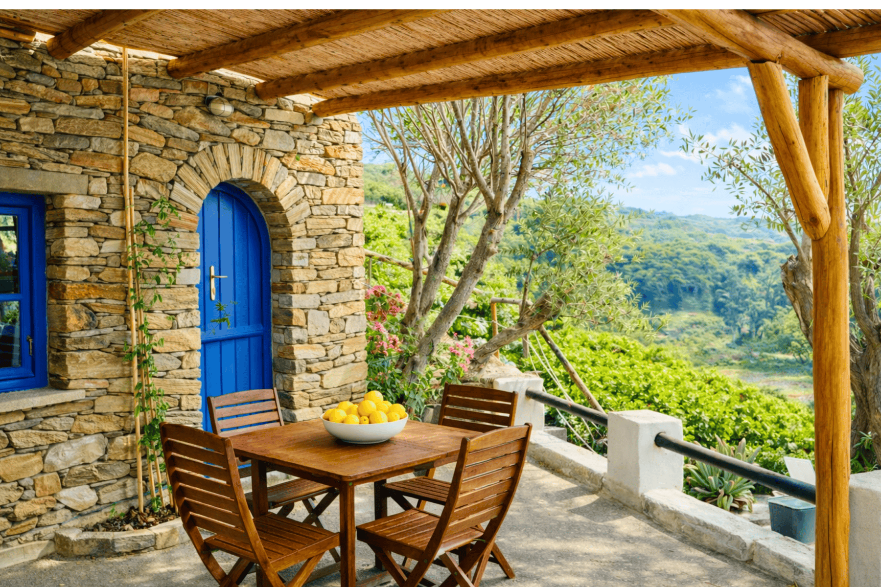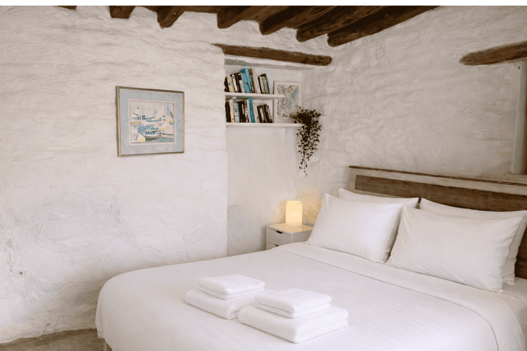 • Authentischer kykladischer Charme: Steinmauern, traditionelle Holzbalken und Dekor im lokalen Stil